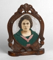 Unidentified photographer, 1940s, Mexican folk photo-sculpture of a curly coiffed woman garbed in a brilliant green top with rouge sash, Fotoscultura, Swann Galleries - New York, LL/56934