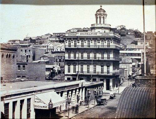 George Robinson Fardon, 1855 (ca), Merchants' Exchange, on Battery street., [San Francisco Album. Photographs of the Most Beautiful Views and Public Buildings of San Francisco], Salt paper print, albumenized, 15.5 x 20.7 cm, George Eastman Museum, Courtesy of George Eastman House, Gift of Eastman Kodak Company: ex-collection Gabriel Cromer,