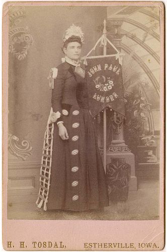 H.H. Tosdal (Estherville, Iowa), 1890s (ca), Banner lady for "John Paul - Lumber", Cabinet card, Private collection of Bill Lee,