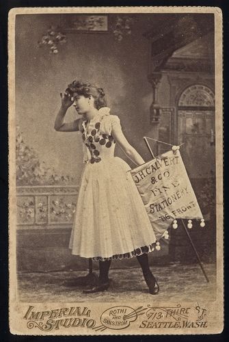 Imperial Studio - Rothi and Sandstrom (713 Third St. Seattle, Wash.), n.d., Banner lady for J.H. Calvert & Co Fine Stationary, Cabinet card, Private collection of Laddy Kite,