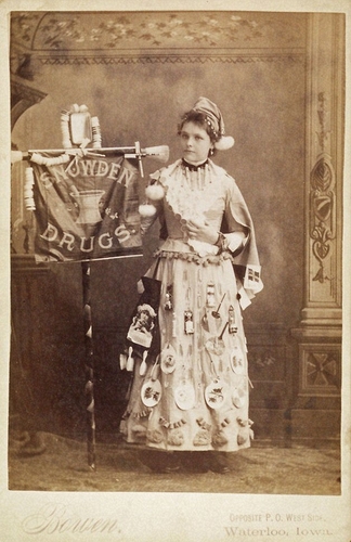 Mrs. G.M. Bowen (Waterloo, Iowa), 1890 (ca), Banner lady for Snowden Drugs, Cabinet card, New York Historical Society, Subject File, PR068,