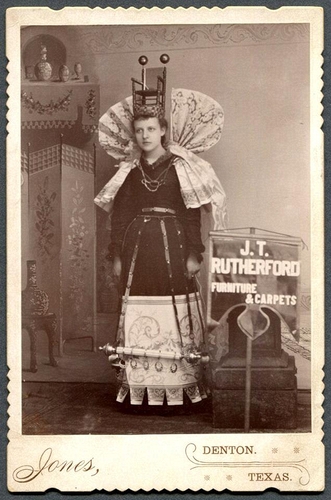 James Talifero Jones (Denton, Texas), 1896-1900 (ca), Banner lady for J.T. Rutherford Furniture & Carpets, Cabinet card, Private collection of Lawrence T. Jones III,