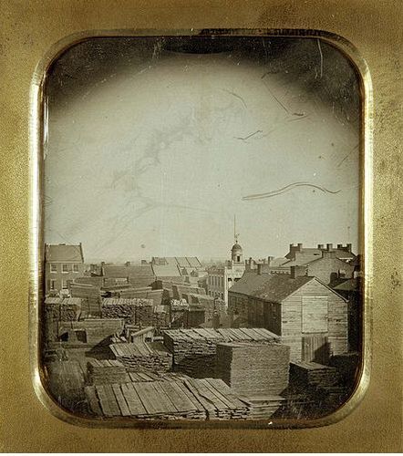 Thomas Easterly, 1848, Locust Street looking east from Fourth Street. View of lumber yard, Daguerreotype, Missouri Historical Society, Courtesy of the Missouri History Museum, Thomas Easterly Collection N17094.,