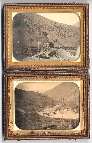 Unidentified photographer, n.d., [top] Mine on Bogus Creek, Siskiyou County. [bottom] Bogus Creek and Bogus Mountain., Daguerreotype, California State Library, Record no: 001379279 (top),,