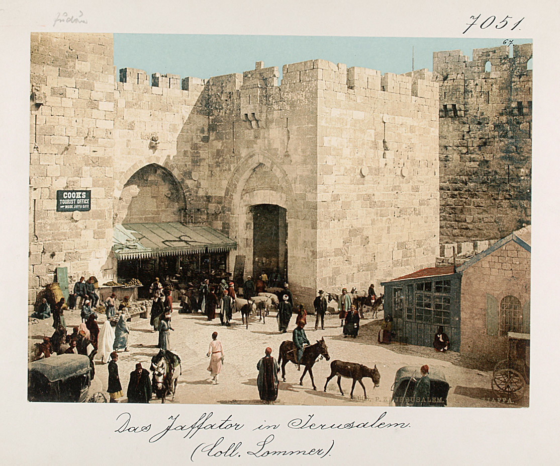 The Jaffa Gate in Jerusalem with a sign for the travel agency Thomas Cook