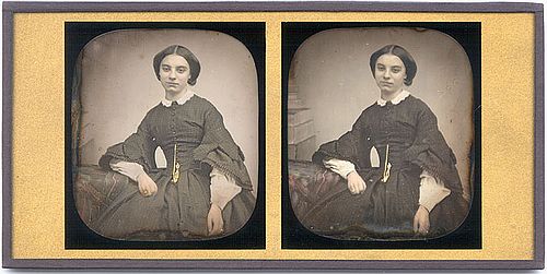 , n.d., Hand-colored stereo daguerreotype of a young woman seated by table,